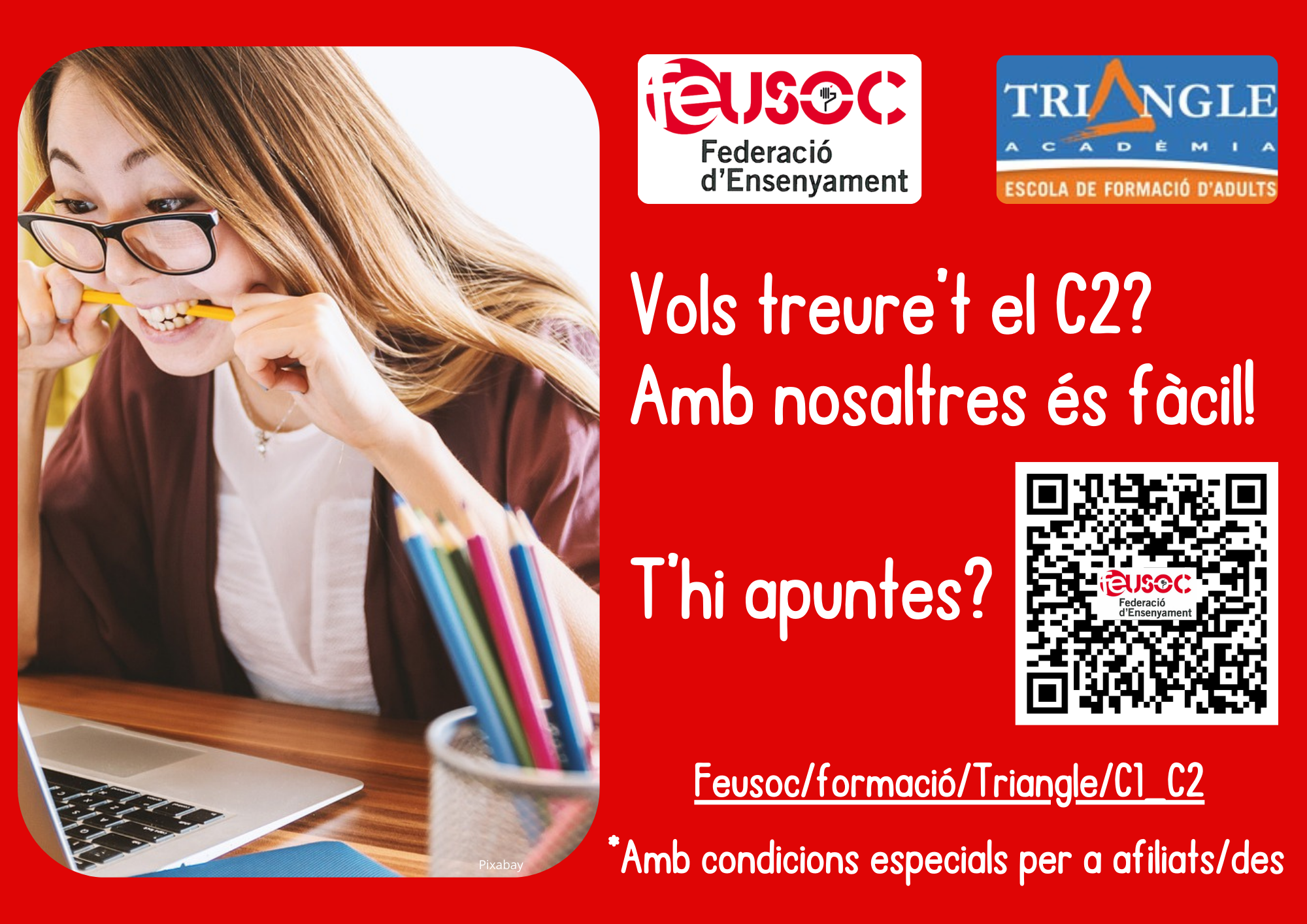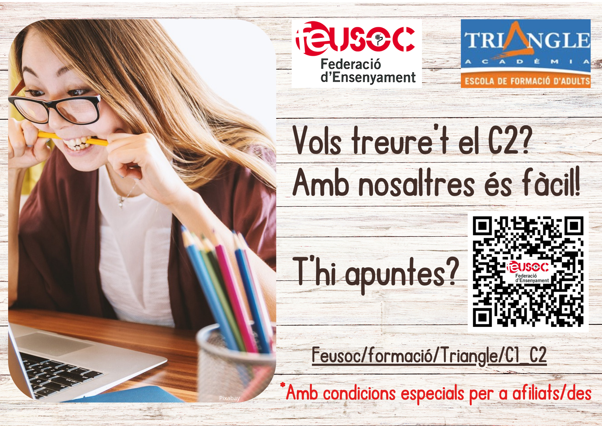 FEUSOC i TRIANGLE hem establert un acord de col·laboració que permet als nostres afiliats i afiliades gaudir d’un descompte significatiu en els cursos de formació i preparació per a l'obtenció dels certificats de català nivells C1 i C2. Per beneficiar-se d’aquest descompte, cal complir les següents condicions: